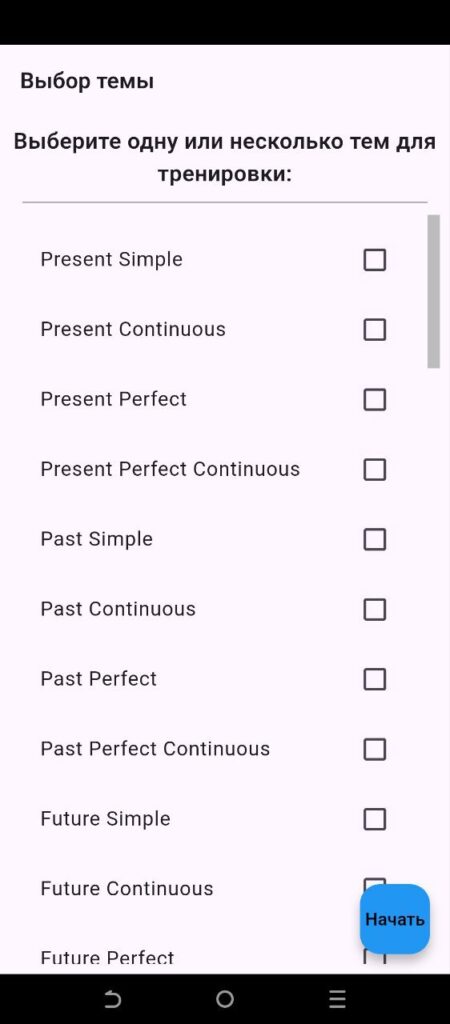 В веб-версии приложения доступны не все функции. Например, там можно выбрать только одну тему для тренировки. В мобильном приложении для Android можно проходить тренировку, выбрав любое количество тем. При этом вопросы перемешиваются между темами, что повышает сложность задания.